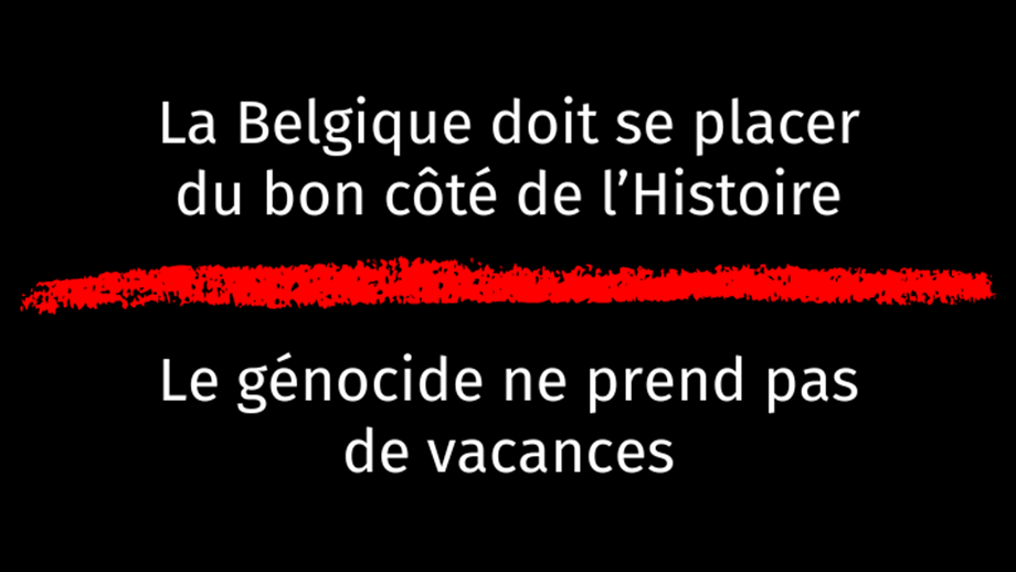 Nous adressons solennellement aux dirigeants de Vooruit, du CD&V et des Engagés la demande de passer aux actes sans aucun délai. Qu'il y ait dans leur gouvernement deux partis qui nient le génocide en cours, ce n'est pas notre choix : c'est le leur. Si ces trois partis ne considèrent pas que l’urgence des multiples alertes de famine mérite d'en faire une question de gouvernement, que leur faut-il ? La destruction totale de tout ce qui fonde une société, infrastructures, systèmes d’éducation, de santé, d’alimentation, en vue d’un jour vider le territoire de ses habitants, tout cela constituant un processus de génocide, est-ce pour eux un détail ? ou un simple objet de communication publicitaire ?