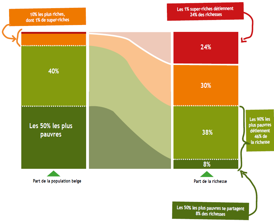 Au niveau mondial, sur l’ensemble des richesses créées en 2020 et 2021, 63% d’entre elles, soit plus de 26 milliards ont été captées par les 1% les plus riches (les 1% les plus riches sont les personnes dont la richesse est supérieure à un million de dollars). Qu'en est-il en Belgique ?