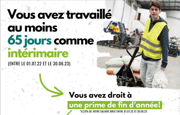 D’abord, si vous avez travaillé au minimum 65 jours (régime 5 jours semaine) ou 494 heures entre le 1er juillet 2022 et le 30 juin 2023, vous avez droit à une prime de fin d’année qui correspond à 8,33% de votre salaire brut. Dans les outils de l’app CSC se trouve un « Intérim Assistant » qui vous aide à savoir si vous avez droit à la prime.