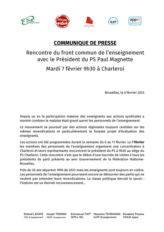 Ces actions ont été programmées durant la semaine du 6 au 11 février. Le 7 février les membres des personnels de l’enseignement organisent une concentration à Charleroi et leurs représentants rencontrent le président du PS à 9h30 au siège du PS Charleroi. Cette rencontre n’est que le début d’une tournée de visites à tous les présidents de parti présents au sein Gouvernement de la fédération Wallonie-Bruxelles.