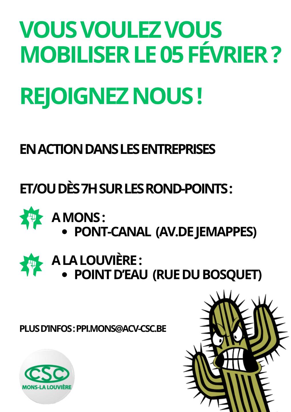 Dans la région de La Louvière, outre les actions de grève menées dans plusieurs entreprises, une action de sensibilisation se tiendra au rond-point dit du "Point d'eau" (rue du bosquet).