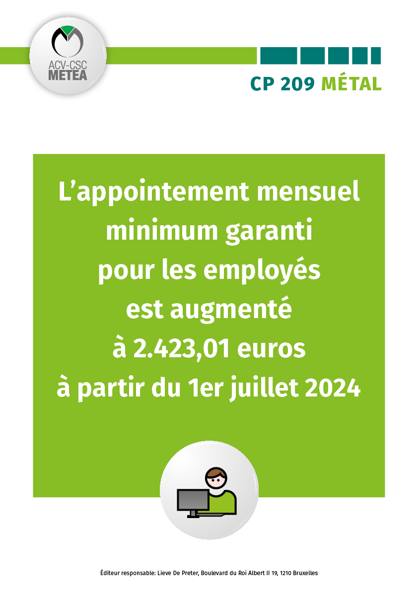 27/06/2024 CP 209 - Employés fabrications métalliques: Des news concernant l’appointement mensuel minimum garanti L’appointement mensuel minimum garanti pour les employés est augmenté à 2.423,01 euros à partir du 1er juillet 2024 Découvrez l'affiche ici ou ici en jpg.